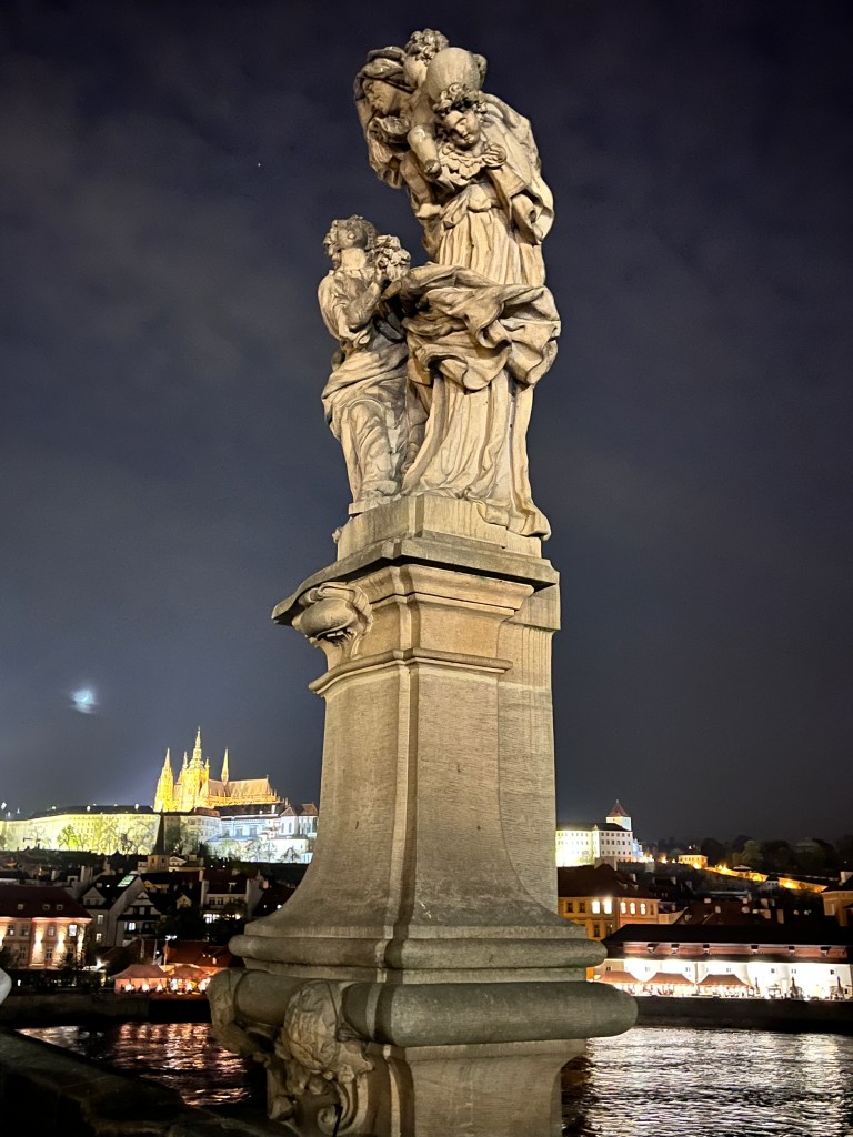 Walked around the Vltava river and crossed Charles Bridge The Vltava is the longest river in Prague, which can be crossed by 17 different bridges. The Charles Bridge is the oldest bridge in Prague, built in 1357! This medieval stone arch bridge has over 30 statues displayed. We walked over the bridge both during the day and at night. At night, it was very dark and you could really feel the spooky/medieval vibes.