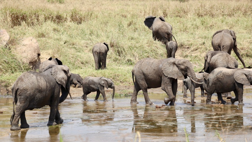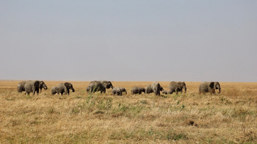 the rhino nursing her baby in the distance – it is very difficult to find rhinos, let alone get close, so we were super happy to be able to see them from far away! The crater’s unique geography and abundant resources make it a haven for wildlife, including elephants that come here towards the end of their lives, earning it the nickname “elephant graveyard.”